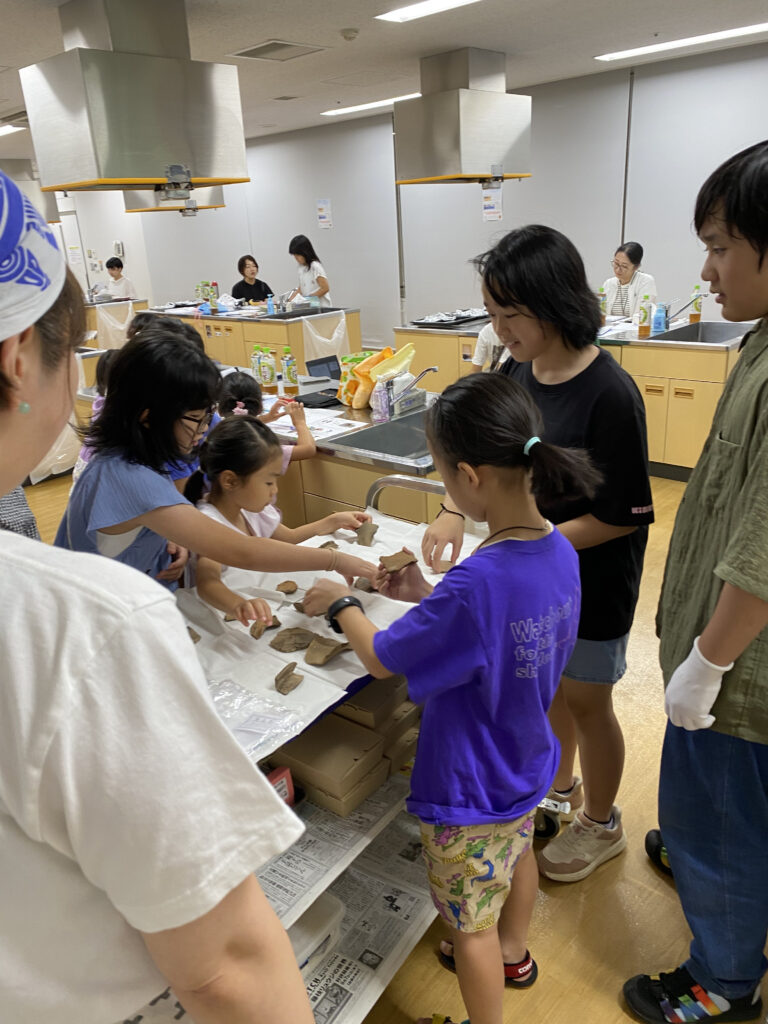 参加者は広島市文化財団のご協力により、広島市出土の本物の土器に直接触れ、観察シートに模様や混和材を記録し、最後に、自分の「相棒土器」とそっくりのクッキーを自由な発想で制作しました。