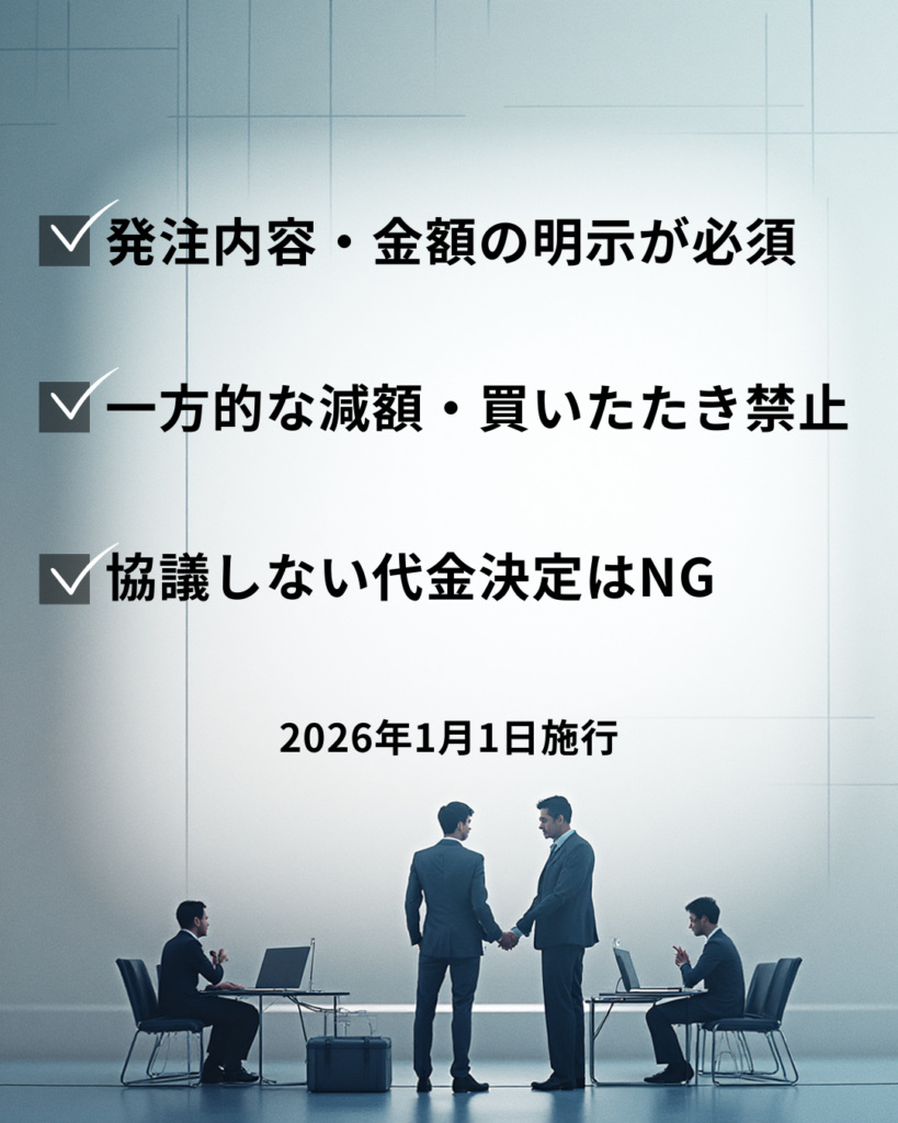 2026年1月1日から、これまで「下請法」と呼ばれてきた法律は、「中小受託取引適正化法(通称:取適法)」として新たに施行されます。