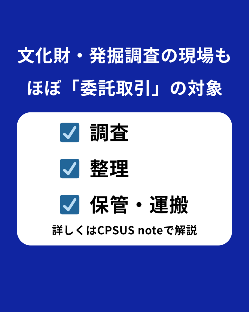 文化財の発掘調査、整理作業、報告書作成、運搬、保存関連業務など、委託取引が多い文化財分野にも、確実に関係してくる制度変更です。